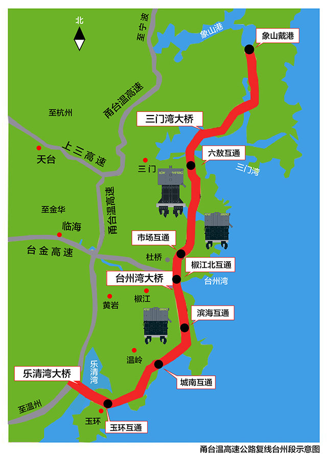 浙江沿海高速公路(又称甬台温高速公路复线)工程。是浙江省"两纵两横十八连三绕三通道"公路主骨架中的"一连",向北经拟建的象山港大桥接杭州湾跨海大桥,直接通往上海。台州沿海高速公路主要由三门湾大桥及接线工程、台州湾大桥及接线工程、乐清湾大桥及接线工程这三个部分串联而成,经过三门、临海、椒江、路桥、温岭、玉环6个县(市、区)。