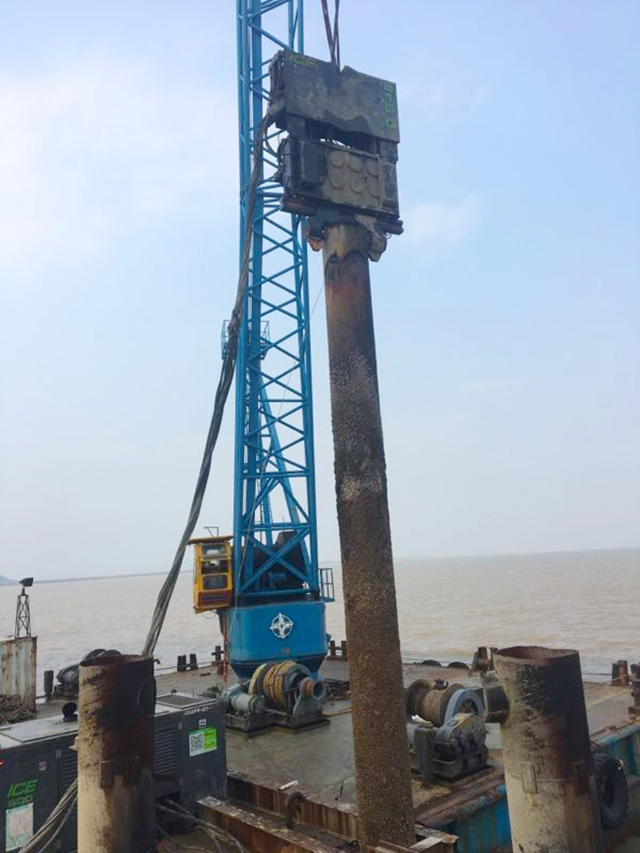 另一位于台州市椒江区前所沿海工业园的台州湾大桥建设单位是广东省长大公路工程有限公司TS09标段。该公司用ICE 815C拆除栈桥钢管桩,桩径800mm,桩长约50米。