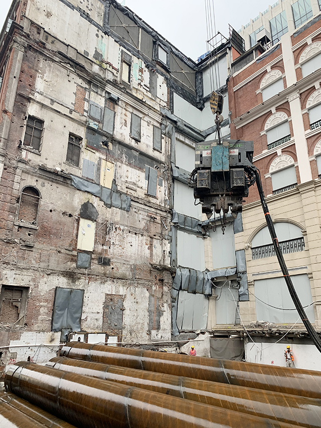 照片和视频展示的是工地现场的基础作业。由于地铁14号线盾构机即将投入施工,西楼的拆除和重建要么在盾构机开工前完成,要么在盾构机作业完工后进行。在两种方案中,都需要用免共振锤来振打钢管桩基础。采用前者是因为这是地基完成的最快方法,而后者是因为免共振打桩不会影响附近的地铁隧道。