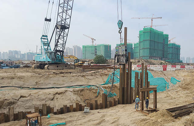 健德合工程有限公司于2022年底购买了Dieseko 集团新推出的ICE 815D液压振动锤,并在澳门启动了首个钢板桩施工项目,桩长24m的6号钢板桩。该桩用于建设市政公用隧道,连接澳当大桥项目的斜坡,非常靠近港澳大桥终端。由动力站由沃尔沃发动机提供动力,振动锤的强大偏心力矩确保了打桩的快速化,节省施工时间。